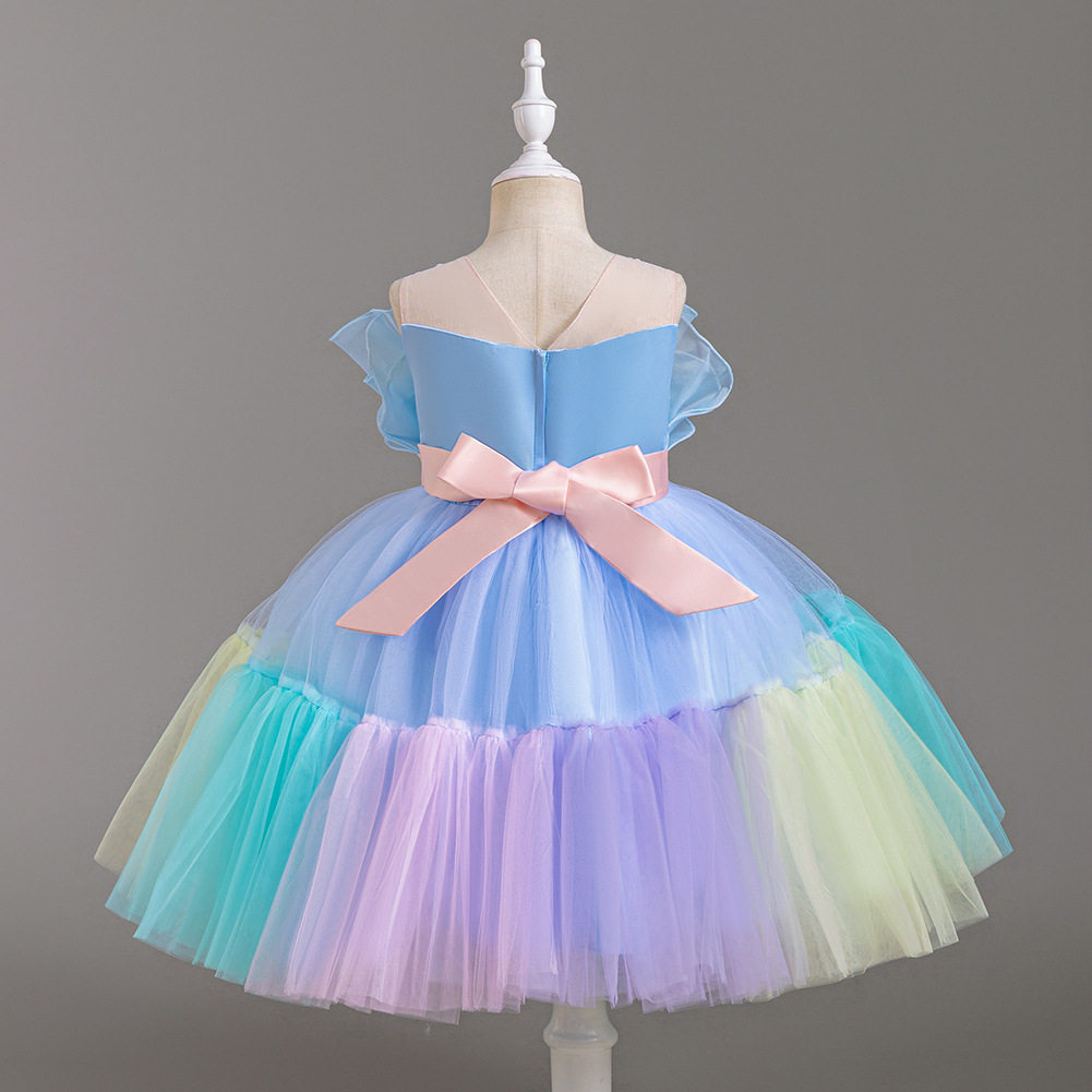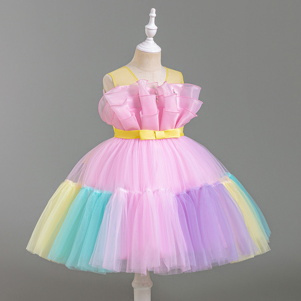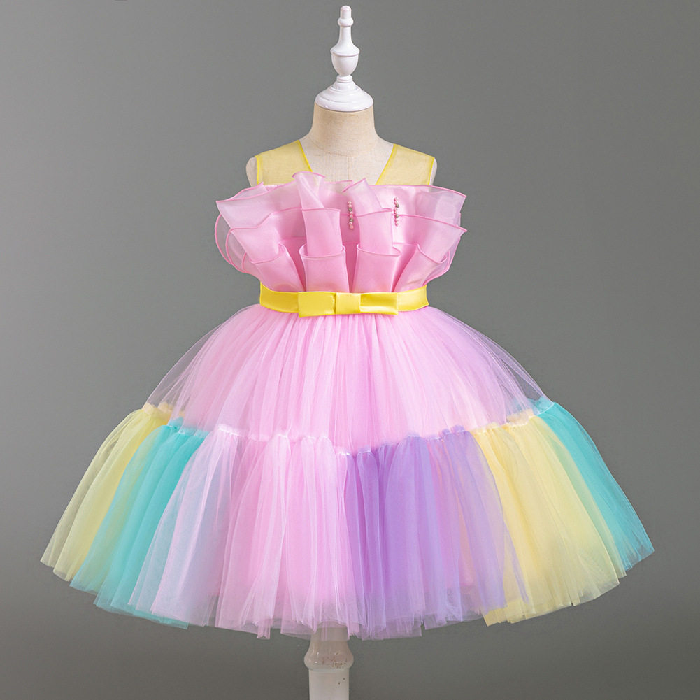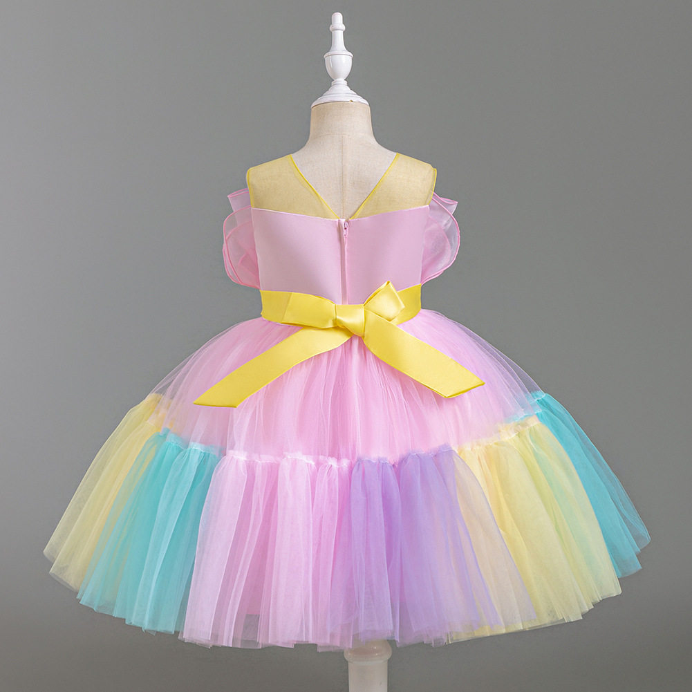 Girls Color Spliced Princess Dress Sleeveless Color Matching Bow Dress Catwalk Piano Performance Dress 363