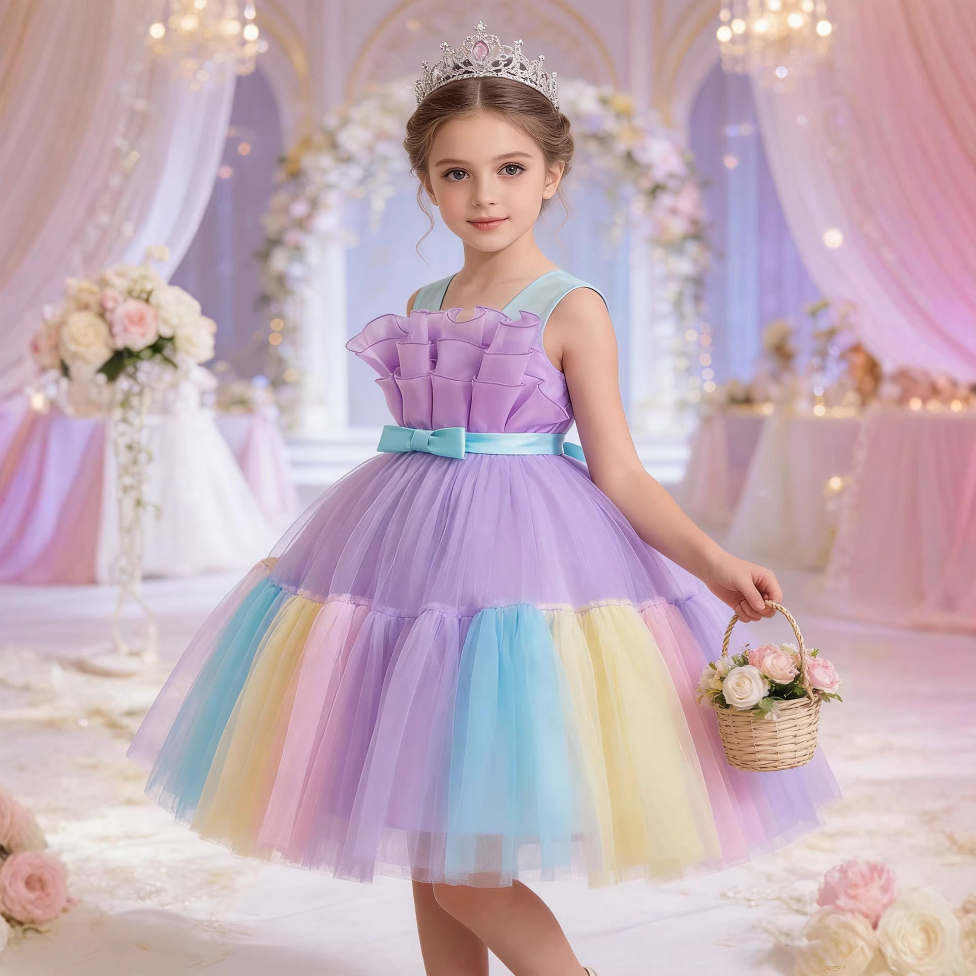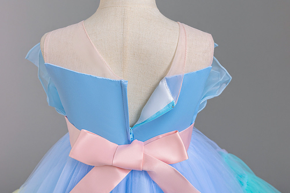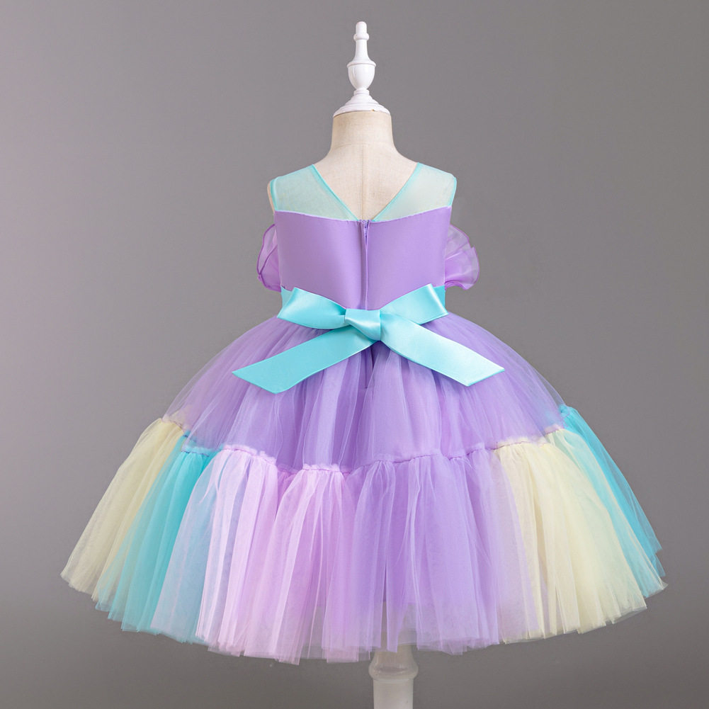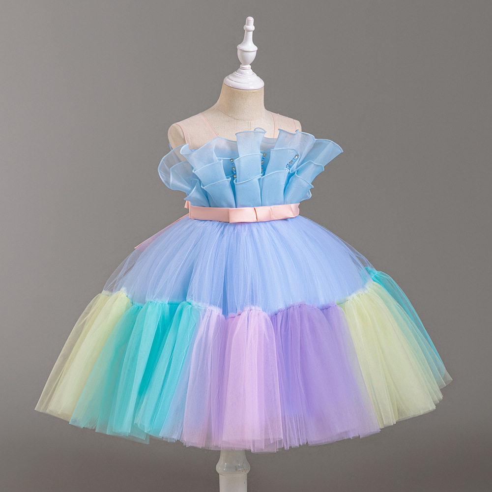 Girls Color Spliced Princess Dress Sleeveless Color Matching Bow Dress Catwalk Piano Performance Dress 363